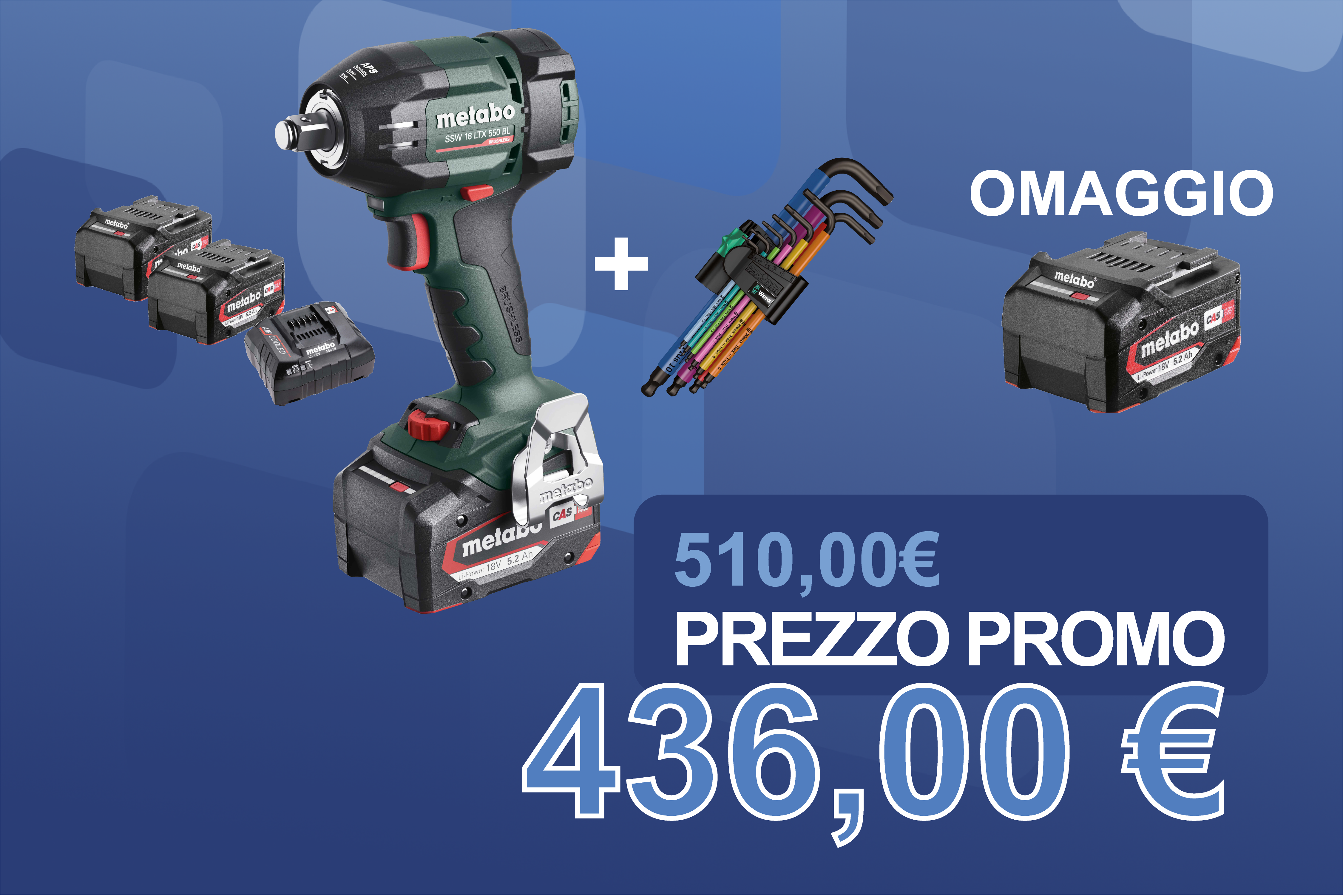 Acquistando questo kit, hai diritto a una terza batteria da 5.2~Ah / 18~V in omaggio (del valore di € 126,00). Ti basterà registrare il prodotto sul sito www.metabopromotion.it .